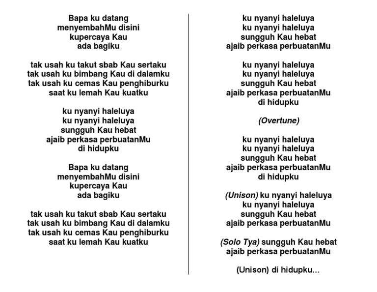 C Gm Dm F Pre-Chorus. Bapa Ku datang MenyembahMu disini Ku percaya Kau Ada bagiku Tak usah ku takut sebab Kau sertaku Tak usah ku bimbang Kau di dalamku Tak usah ku cemas Kau penghiburku Saat ku lemah Kau kuatku Kunyanyi haleluya Kunyanyi haleluya Sungguh Kau hebat Ajaib perkasa PerbuatanMu Kunyanyi haleluya Kunyanyi haleluya. Lirik Lagu Ku Nyanyi Haleluya Chord Lagu Bapaku Datang Nasi Me lirik kunyanyi haleluya symphony worship bapa ku datang menyembahmu di siniku percaya kau ada bagiku bapa ku datang menyemba.